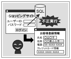そんなある日のことです。このサイトが繁盛していることを知った悪意のある人間がいました。彼は会員ページの入り口にあるログインページに目を付けました。ログインページのユーザID入力欄に、コマンドを含む特殊な文字列を入力する「SQLインジェクション」という手法を試みました。すると、なんとパスワードを知らなくても、会員ページにログインできてしまうことが分かりました。会員ページに入ってしまえば、会員の住所や氏名、電話番号、購入履歴の他に、クレジットカード番号まで参照できるのです。このような方法で、Wさんの会社のショッピングサイトから会員の個人情報が大量に漏洩してしまったのです。