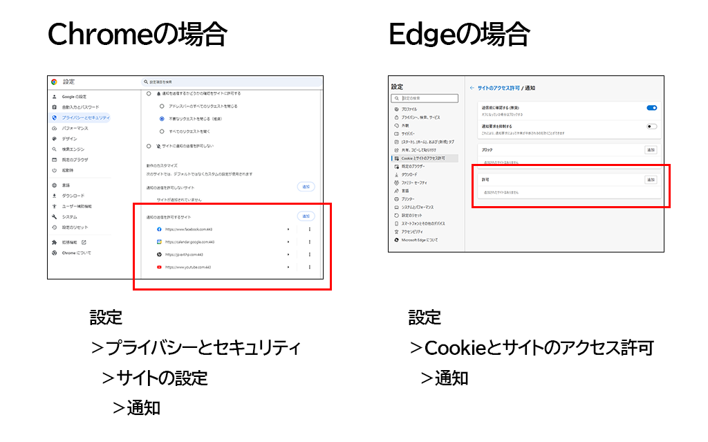 - ブラウザの設定の通知を確認し、不審な通知を削除する