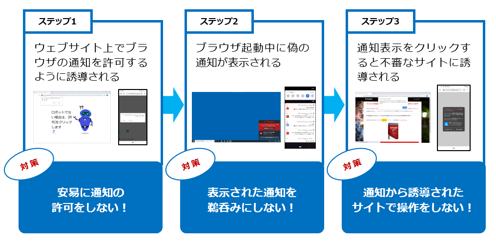 この手口のやっかいなところは、脆弱性を狙ったものではなく、Webブラウザの標準機能を悪用しているところです。一部のWebサイトでは、Webサイトを閲覧した方に、Webブラウザの通知機能を使ってメッセージ表示をする場合があります。特殊なものではなく、広く一般的に使われている手法です。